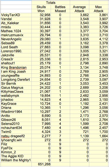 With the exception of the newbies (welcome) everyone fought (almost) -Top Job People ! Hope you got some good chests :-)